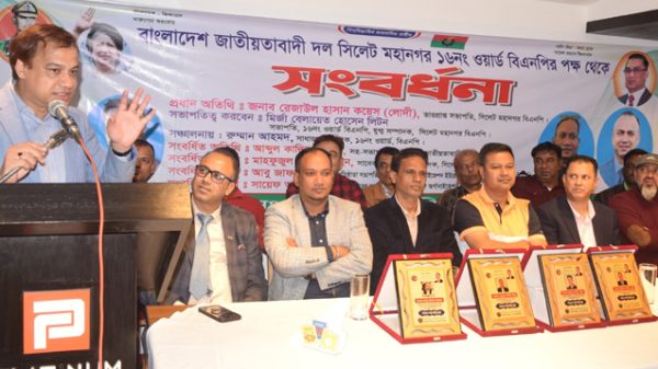 ১৬নং ওয়ার্ড বিএনপি সভাপতি মির্জা বেলায়েত হোসেন লিটনের সভাপতিত্বে ও সাধারণ সম্পাদক রুম্মান আহমদের পরিচালনায় প্রবাসী ছাত্রদলের সাবেক ৪ নেতার সংবর্ধনা অনুষ্ঠানে বিশেষ অতিথি হিসেবে বক্তব্য রাখেন সিলেট চেম্বারের সাবেক সহ-সভাপতি আব্দুস সামাদ তুহেল, মহানগর বিএনপির সাংগঠনিক সম্পাদক দেওয়ান জাকি, মামুন আহমদ মিন্টু।