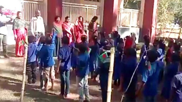 জানা যায়, সিলেটের জৈন্তাপুর উপজেলায় শ্রীখেল সরকারি প্রাথমিক বিদ্যালয়ের প্রধান শিক্ষক মো: ফরিদ আহমদ মহান বিজয় দিবস উপলেক্ষ শিক্ষার্থীদের নিয়ে বিদ্যালয় মাঠে ‘জয় বাংলা’, ‘জয় বঙ্গবন্ধু’ স্লোগান দেন।