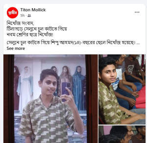 সিলেট নগরীর টিলাগড়ে সেলুনে চুল কাটতে গিয়ে শিপু আহমদ (১৪) বছরের এক স্কুল ছাত্র নিখোঁজ হয়েছে। সে শাহপরান থানাধীন শাপলাবাগ এলাকার রোড নং-০১, ৮০ নং বাসার বাসিন্দা সমছু মিয়ার ছেলে। এ বিষয়ে নিখোজের পরিবারের পক্ষ থেকে শাহপরান থানায় একটি সাধারণ ডায়েরি করা হয়েছে।