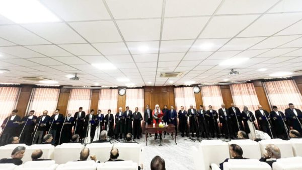 প্রথম সকাল ডেস্ক:- সুপ্রিম কোর্টের হাইকোর্ট বিভাগে নতুন নিয়োগ পাওয়া ২৩ বিচারপতি শপথ নিয়েছেন। আজ বুধবার (৯ অক্টোবর) সকাল ১১টায় সুপ্রিম কোর্টের জাজেস লাউঞ্জে নতুন এই বিচারপতিদের শপথ বাক্য পাঠ করান প্রধান বিচারপতি ড. সৈয়দ রেফাত আহমেদ। শপথ অনুষ্ঠান পরিচালনা করেন সুপ্রিম কোর্টের রেজিস্ট্রার জেনারেল আজিজ আহমদ ভূঞা।