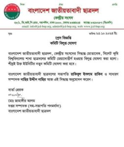 বাংলাদেশ জাতীয়তাবাদী ছাত্রদলের সভাপতি রাকিবুল ইসলাম রাকিব ও সাধারণ সম্পাদক নাছির উদ্দীন নাছির এই সিদ্ধান্ত অনুমোদন করেন।