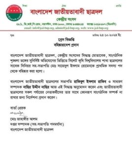 অন্য এক সংবাদ বিজ্ঞপ্তিতে কৃষি বিশ্ববিদ্যালয় শাখা ছাত্রদলের সাবেক সিনিয়র সহ- সভাপতি মোঃ সাহেদুল ইসলাম রোমেনকে বহিস্কারের কথা জানানো হয়।