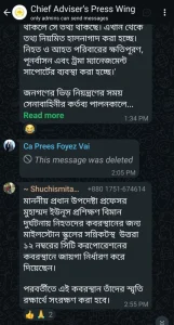একই সময়, প্রধান উপদেষ্টার প্রেস উইংয়ের হোয়াটসঅ্যাপ গ্রুপেও পোস্টটি শেয়ার করেন সিনিয়র সহকারী প্রেস সচিব ফয়েজ আহম্মদ। পরে সেটিও এই গ্রুপ থেকে সরিয়ে নেওয়া হয়।