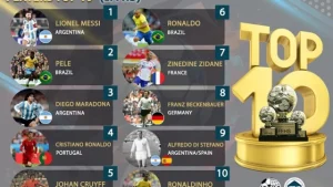 দুইয়ে আছেন তিনটি বিশ্বকাপ জেতা ব্রাজিলিয়ান কিংবদন্তি পেলে। আর তিনে জায়গা করে নিয়েছেন আরেক আর্জেন্টাইন কিংবদন্তি ডিয়াগো ম্যারাডোনা। চার নম্বরে জায়গা পেয়েছেন পাঁচবারের ব্যালন ডি’অর জয়ী ক্রিশ্চিয়ানো রোনালদো।