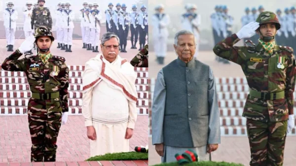 প্রথম সকাল ডেস্ক:- মহান বিজয় দিবসে সাভারে জাতীয় স্মৃতিসৌধে বীর শহীদদের প্রতি শ্রদ্ধা জানিয়েছেন রাষ্ট্রপতি মো. সাহাবুদ্দিন ও অন্তর্বর্তী সরকারের প্রধান উপদেষ্টা ড. মুহাম্মদ ইউনূস। সোমবার (১৬ ডিসেম্বর) সকাল সাড়ে