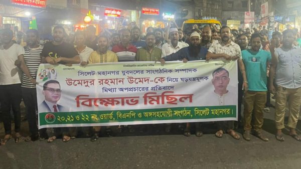 সিলেট মহানগর যুবদলের সাংগঠনিক সম্পাদক উমেদুর রহমান উমেদের বিরুদ্ধে ষড়যন্ত্রমূলক প্রকাশিত সংবাদের প্রতিবাদে সিলেট সিটি কর্পোরেশন ২০, ২১, ২২ নং ওয়ার্ড বিএনপির উদ্যোগে বিক্ষোভ মিছিল অনুষ্ঠিত হয়েছে। সোমবার সন্ধ্যা ৭টার