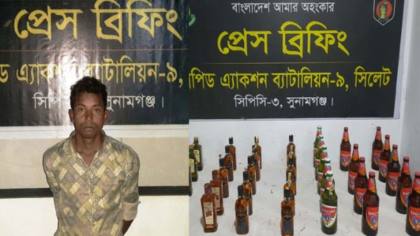 সুনামগঞ্জ প্রতিনিধি:- সুনামগঞ্জে ৩৪ বোতল বিদেশী মদ ও বিয়ারসহ ১ জনকে আটক করেছে র্যাব-৯। বৃহস্পতিবার (৯ জানুয়ারি) বুধবার রাতে সুনামগঞ্জ জেলার সদর থানা এলাকায় অভিযান পরিচালনা করে তাকে আটক করা