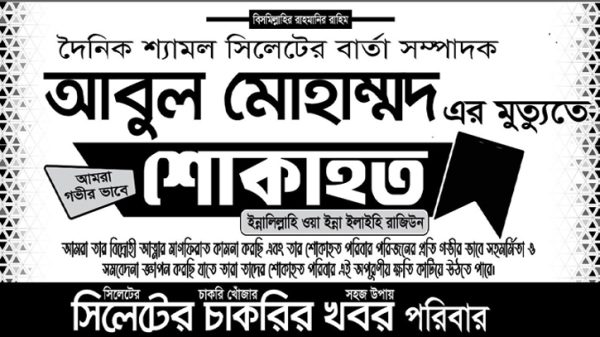 দৈনিক শ্যামল সিলেট পত্রিকার প্রধান বার্তা সম্পাদক এবং সিলেট জেলা প্রেসক্লাবের প্রতিষ্ঠাতা সদস্য মোহাম্মদ আবুল হোসেন (আবুল মোহাম্মদ)-এর মৃত্যুতে গভীর শোক ও সমবেদনা জানিয়েছেন দৈনিক সবুজ সিলেট পত্রিকার সম্পাদক ও