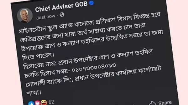 রাজধানীর উত্তরায় মাইলস্টোন স্কুল অ্যান্ড কলেজে বাংলাদেশ বিমানবাহিনীর যুদ্ধবিমান বিধ্বস্ত হওয়ার ঘটনায় ক্ষতিগ্রস্তদের জন্য অর্থসহায়তা চেয়ে প্রধান উপদেষ্টার ভেরিফায়েড ফেসবুক পেজ থেকে দেওয়া একটি পোস্ট ঘিরে সামাজিক যোগাযোগমাধ্যমে সমালোচনার ঝড়