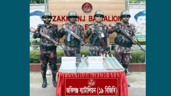 বর্ডার গার্ড বাংলাদেশ (বিজিবি) এর ১৯ ব্যাটালিয়নের জকিগঞ্জ ইউনিটের বিশেষ অভিযানে এয়ারগান, দেশীয় অস্ত্রসহ প্রায় ১৬ লাখ টাকার ভারতীয় চোরাচালানি পণ্য জব্দ করা হয়েছে। রোববার (১২ অক্টোবর) বিজিবি-১৯ এর পক্ষ